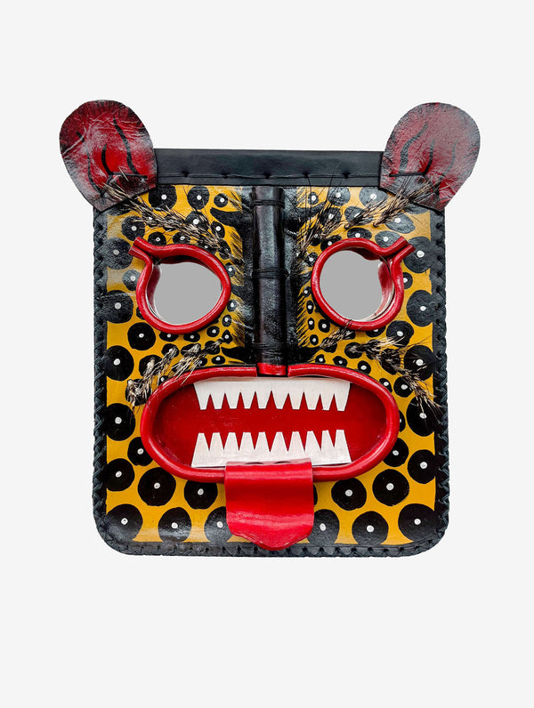 Bolsa de hombro hecha a mano con piel e inspirada en las máscaras tecuán. Las costuras son visibles y hechas con hilo algodón. Los ojos son espejos y los bigotes y cejas están hechos de pelos de jabalí. La bolsa cuenta con forro de algodón. Pintada a mano por artesanos de Ocumicho Michoacán.