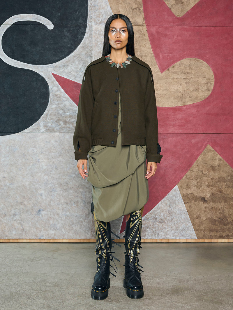 Chamarra tipo "bomber" de manga larga con elegantes diseños de charretera en los hombros y los puños. La prenda también está diseñada con un elegante Sol Azteca bordado a mano en la espalda.