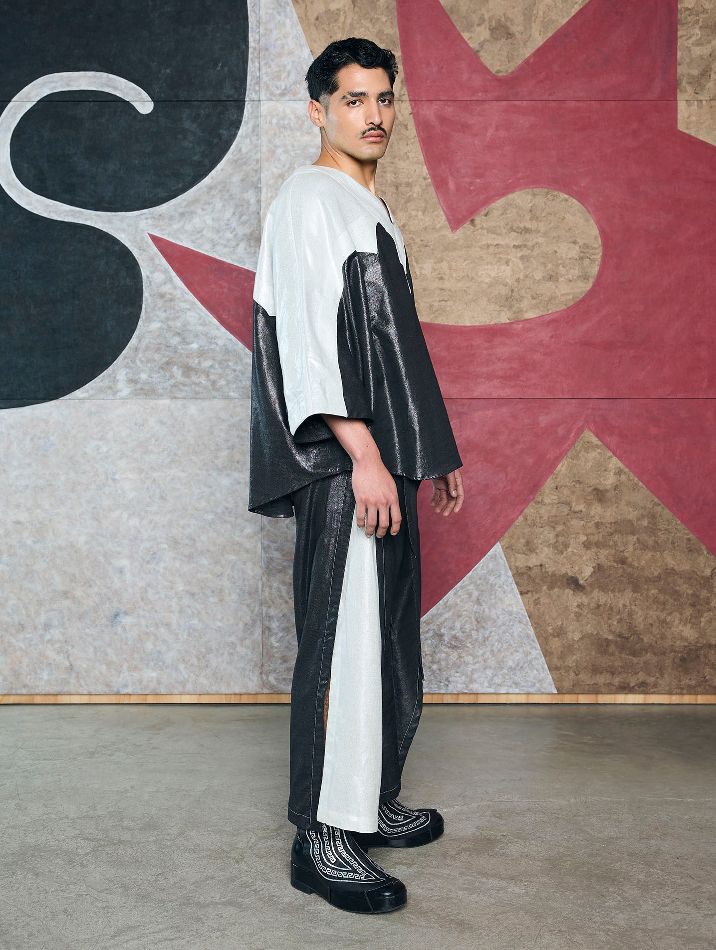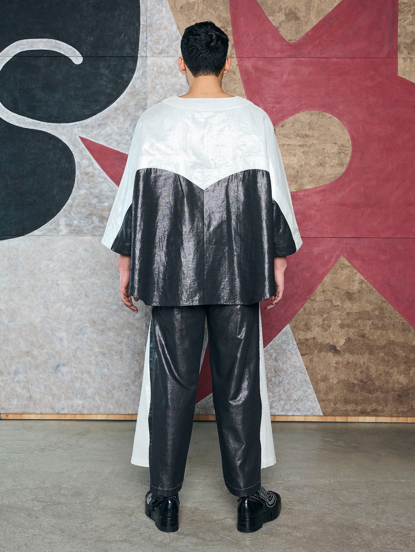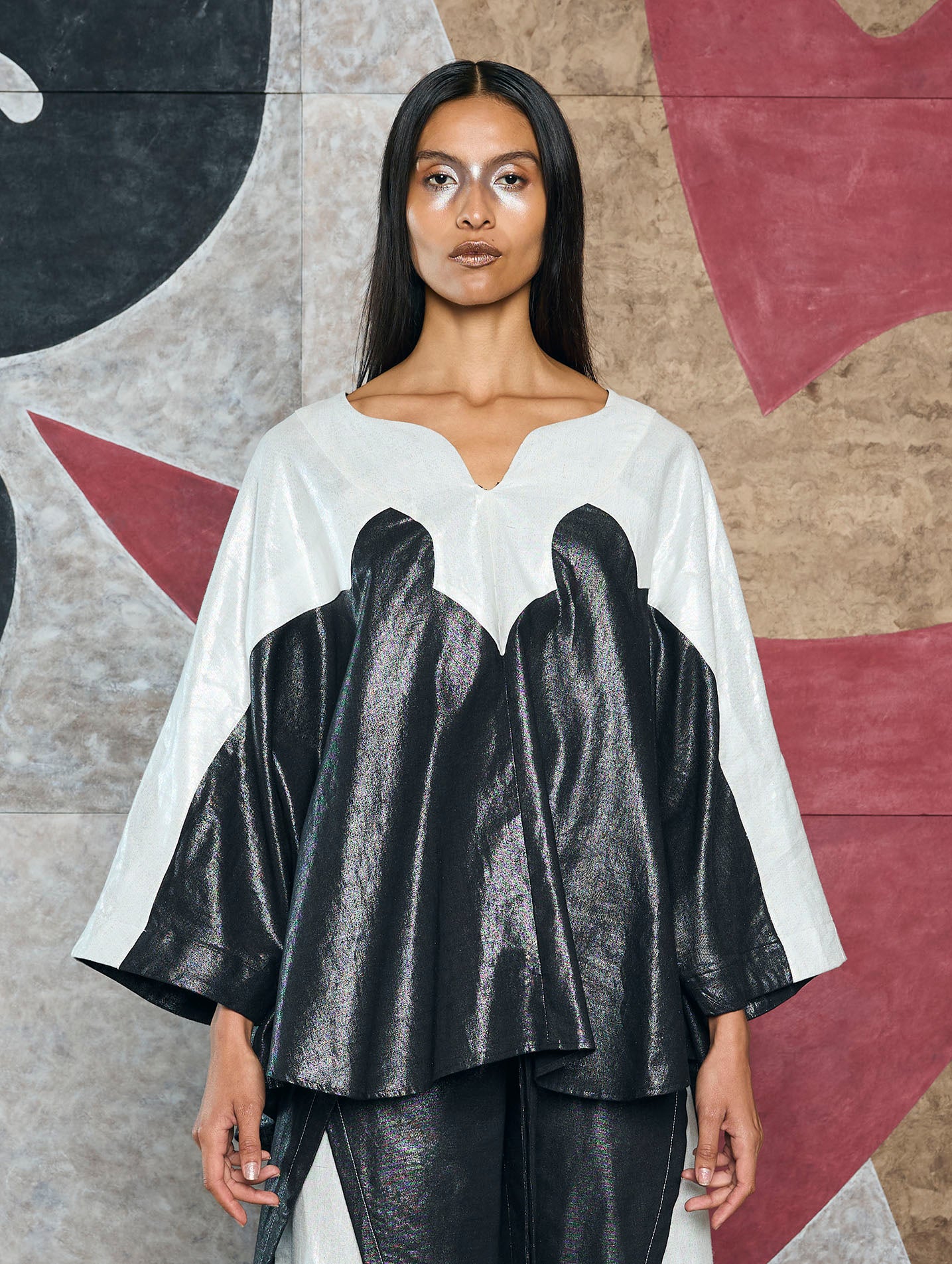 Blusa amplia bicolor con manga 3/4, cortes en forma horizontal inspirados en el oeste, escote en "V"