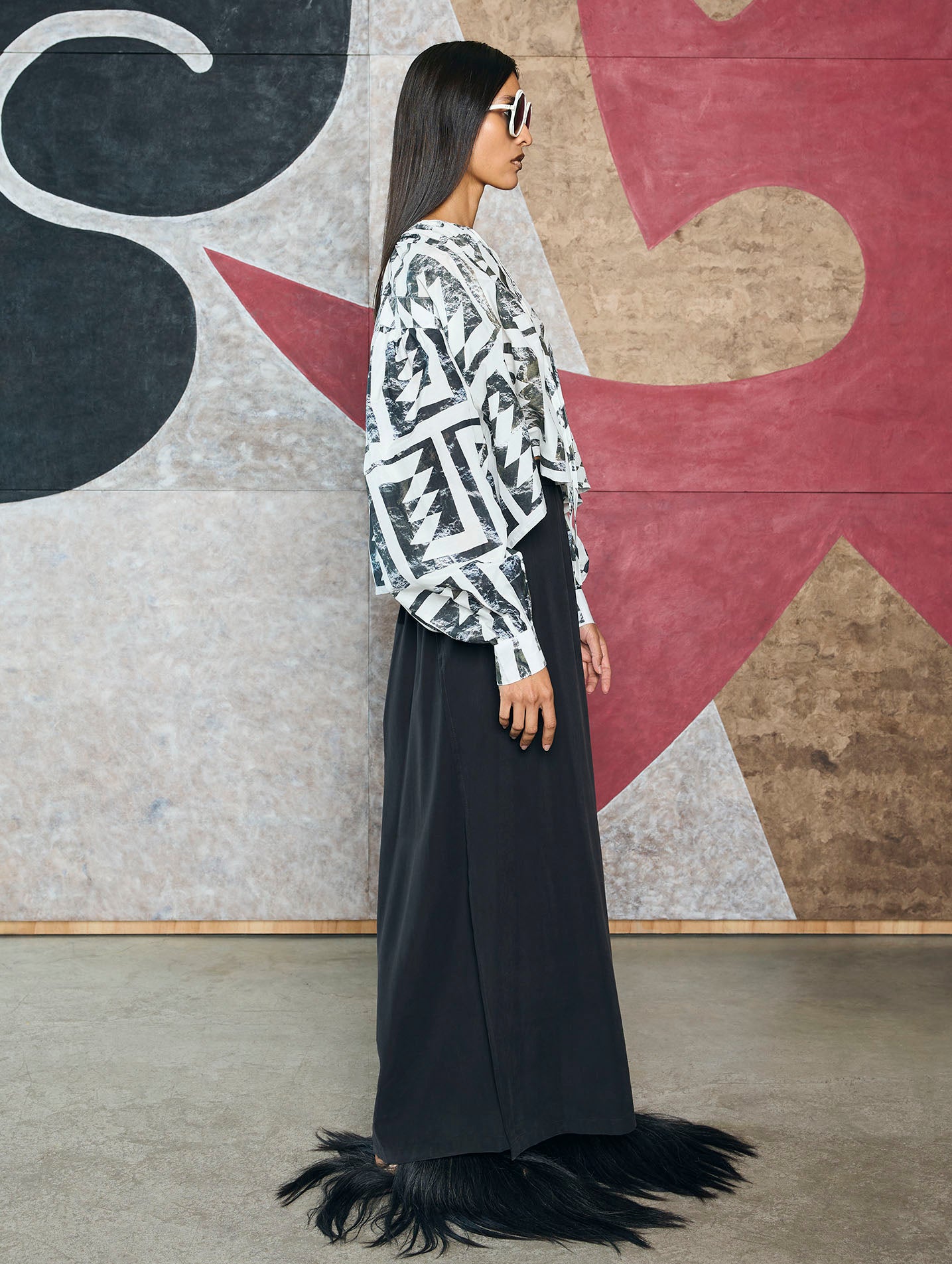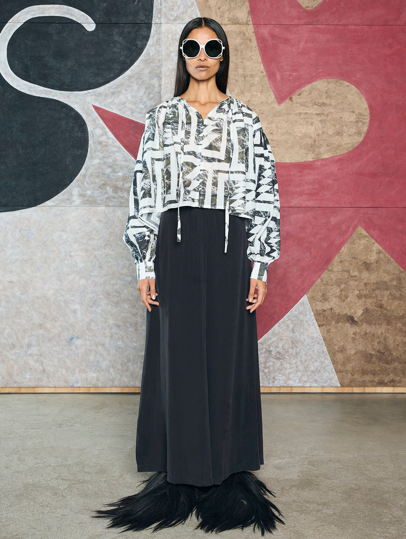 Blusa corta estampada con elegantes mangas acampanadas y cuello tipo V ajustable con discretas cintillas.