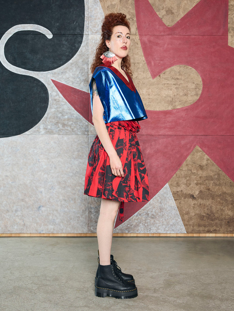 Minifalda tableada diseñada con cintas largas para ajustar al gusto. Versátil y fresca, el contraste de colores y su estampado la hacen una prenda ideal para cualquier ocasión.