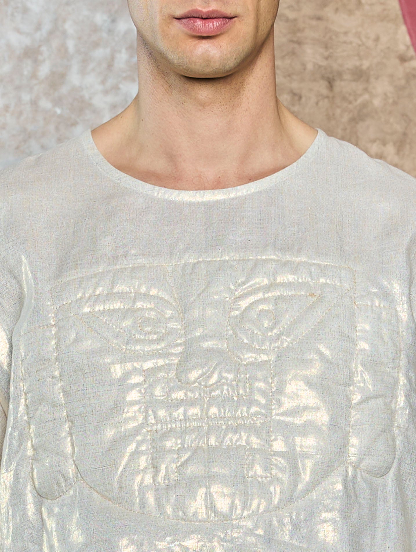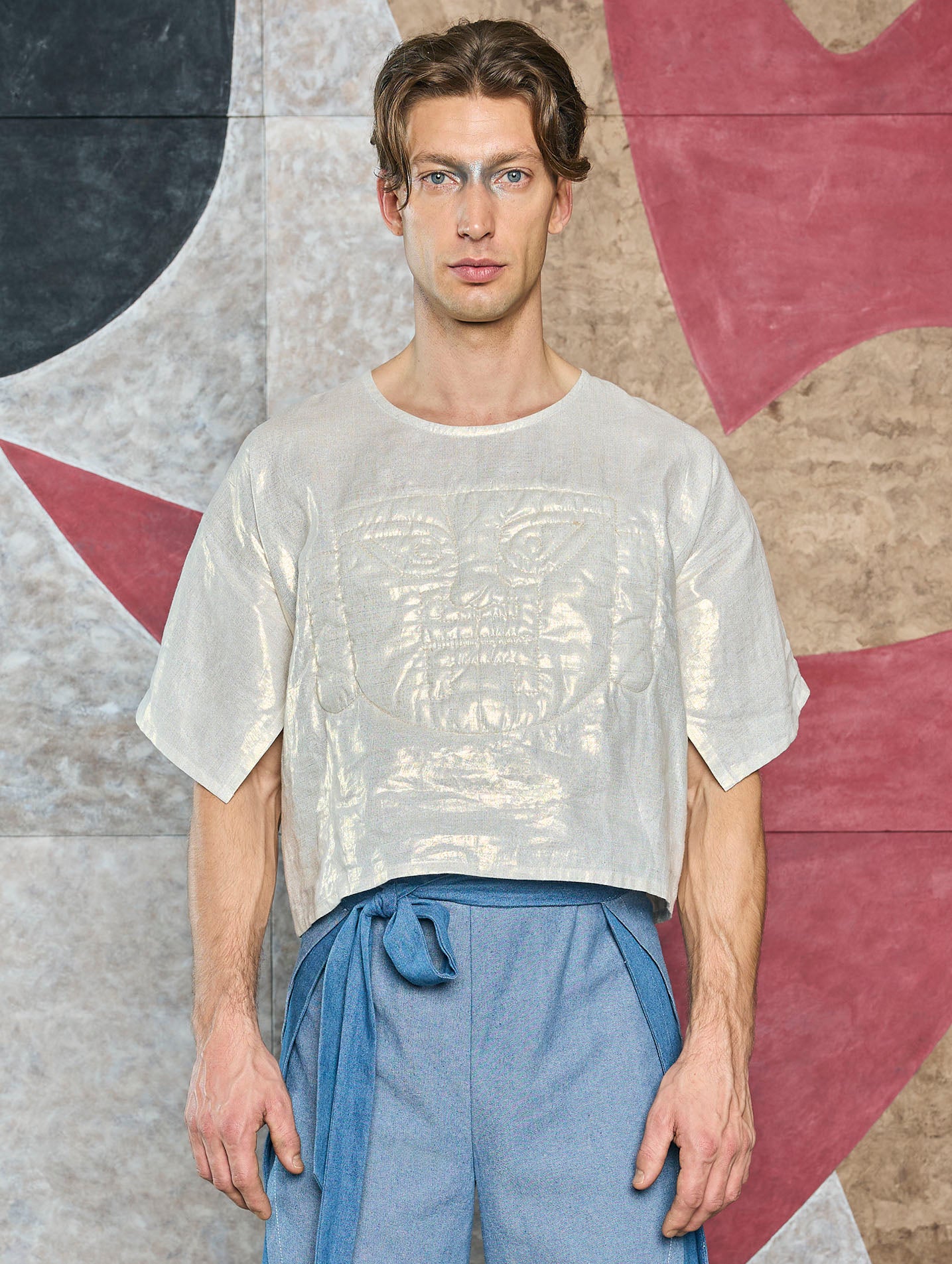 Top corto con caída recta y escote redondo. Con estilizadas mangas tipo 3/4, también cuenta con un diseño original de máscara prehispánica al frente.